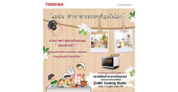 เชื่อว่าอาหารมื้อแรกในชีวิตของหลายๆ คน มาจากฝีมือคุณแม่ บริษัท โตชิบา ไทยแลนด์ จำกัด ชวนคุณลูกๆ นำสิ่งที่ดีสู่ชีวิต รับวันแม่ กับกิจกรรม “แม่ฉัน…ทำอาหารอร่อยที่สุดในโลก” กติกาเพียงโพสต์ภาพถ่ายคู่กับคุณแม่ขณะเข้าครัว พร้อมอวดความอร่อยของรสมือแม่ ว่าเมนูไหนถูกใจคุณที่สุด สำหรับภาพพร้อมคำบรรยายที่ดูแล้วอิ่มเอม ถูกใจกรรมการที่สุด รับคลาสเรียนทำอาหารกับคุณแม่ ด้วยเตาอบไมโครเวฟโตชิบา ที่ ABC Cooking Studio (สาขาเซ็นทรัลเวิลด์ หรือเซ็นทรัล อีสวิลล์) รางวัลละ 2 ใบ มูลค่า 2,000 บาท จำนวน 12 รางวัล โดยร่วมกิจกรรมได้ที่แฟนเพจโตชิบา www.facebook.com/ToshibaSociety ตั้งแต่วันนี้ จนถึงวันที่ 9 สิงหาคมนี้ พร้อมประกาศผลรางวัลในวันที่ 10 สิงหาคม 2561 ทางหน้าแฟนเพจ