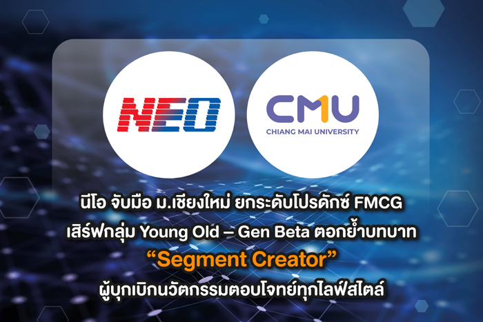 บริษัท นีโอ คอร์ปอเรท จำกัด (มหาชน) หรือ NEO โดย ‘บริษัท นีโอ แฟคทอรี่ จำกัด’ จับมือ มหาวิทยาลัยเชียงใหม่ ร่วมวิจัยและพัฒนานวัตกรรมสินค้ากลุ่ม FMCG รองรับไลฟ์สไตล์ผู้บริโภคในปัจจุบัน โดยเฉพาะกลุ่มที่มีความต้องการเฉพาะ “Young Old (Yold) และ Gen Beta (เด็กเล็ก)” พร้อมสนับสนุนผลงานของนักวิจัยไทยให้นำไปประยุกต์ใช้ได้จริงตามแนวคิด “จากหิ้ง สู่ห้าง” เพื่อต่อยอดให้เป็นที่ยอมรับในระดับสากล พร้อมเปิดโอกาสให้นักศึกษาได้แสดงศักยภาพ และเสริมสร้างทักษะในโลกธุรกิจจริง ตอกย้ำบทบาท “Segment Creator” ที่มุ่งคิดค้นและพัฒนาผลิตภัณฑ์เพื่อยกระดับการใช้ชีวิตที่ดีขึ้นในทุกวัน (Uplift the Essentials for Everyday Betterment)