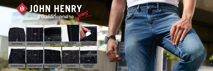 JOHN HENRY JEANS เปิดตัวด้วยคอลเลคชั่นแรกที่มาพร้อมกับการเย็บตะเข็บคู่บริเวณจุดสำคัญเสริมความแข็งแรง ที่บริเวณตะเข็บขาด้านในเย็บแบบสามชั้นยากต่อการฉีกขาดในบริเวณเป้ากางเกง ห่วงเข็มขัดเย็บใต้ขอบเอวเพิ่มความแน่นหนาป้องกันการหลุดขาดเมื่อใช้งาน เทคนิคการเย็บตะเข็บย้อนกลับช่วยซ่อนขอบผ้า เพิ่มความเรียบเนียน สวยงาม และลดการเสียดสี โลหะทั้งหมดไม่ว่าจะ หมุด กระดุม เรียบแบน เพื่อไม่ให้เกะกะหรือเกี่ยวพันกับสิ่งอื่นๆ มาพร้อมดีไซน์อันโดดเด่นที่บริเวณกระเป๋าหลังด้านซ้ายเดินตะเย็บเป็นอักษรตัว “J” สื่อถึง Journey หรือการเดินทาง ส่วนกระเป๋าด้านขวาเดินตะเข็บเป็นอักษรตัว “H” สื่อถึง Home หรือ จุดหมาย ทำให้ผู้สวมใส่รู้สึกว่าไม่ว่าพวกเขาจะเดินทางไปที่ไหน กางเกงยีนส์นี้จะเป็นทั้งเพื่อนร่วมทางและที่พักใจ ส่วนขอบเอวแบบบิดกลับเพิ่มดีไซน์ให้โดดเด่นเป็นเอกลักษณ์ กระเป๋ากางเกงทั้งด้านหน้าและด้านหลังออกแบบความลึกมาเพื่อรองรับกับองศาของมือสะดวกยิ่งขึ้น ห่วงเข็มขัดคู่ที่บริเวณกลางขอบเอวด้านหลังช่วยพยุงไม่ให้กางเกงหลุดสะโพก หนุ่มๆ จึงสวมใส่ได้อย่างมั่นใจ