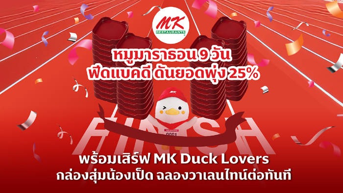 MK Restaurants ฉลองความสำเร็จจากแคมเปญหมูมาราธอน ทุบสถิติใหม่เพียง 9 วัน กว่า 1 ล้านคอนโด ทุกสาขาทั่วประเทศ สร้างกระแสตอบรับดีเกินคาด สามารถดึงดูดทั้งกลุ่มลูกค้าเดิมและจากกลุ่มลูกค้าใหม่ที่เพิ่มขึ้นเป็นจำนวนมาก ส่งผลให้ลูกค้าเข้าร้านเพิ่มขึ้นกว่า 20% ปิดจบแคมเปญด้วยยอดขายเพิ่มกว่า 25% และกว่า 600,000 Engagement บนโลกโซเชียล