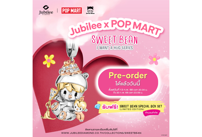 จากการร่วมมือครั้งประวัติศาสตร์ที่นำความลักชูรีมาผสานกับความน่ารัก Jubilee Diamond ขอนำเสนอ “Sweet Bean – I Want A Hug Series” คอลเลกชันเครื่องประดับเพชรแท้ระดับไฮเอนด์ที่สร้างสรรค์ร่วมกับ POP MART มอบโอกาสสุดเอ็กซ์คลูซีฟให้คุณเป็นเจ้าของก่อนใครในโลก เปิดให้สั่งจองแล้ว พร้อมสิทธิพิเศษ 6 ต่อห้ามพลาดสำหรับช่วงพรีออเดอร์นี้เท่านั้น!
