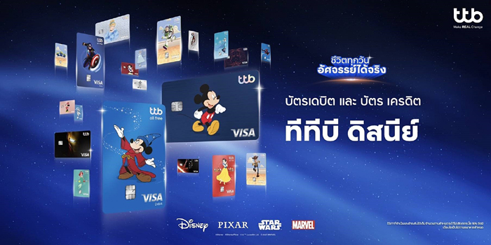 การเปิดตัวบัตรเดบิตและบัตรเครดิต ทีทีบี ดิสนีย์ นี้ มีลายหน้าบัตรให้เลือกมากถึง 20 ลาย จากแบรนด์ดังของดิสนีย์ ทั้ง Disney, Pixar, Marvel and Star Wars characters เช่น Mickey & Friends, Disney Princess heroines, Elsa จาก Frozen, Buzz Lightyear จาก Toy Story, Marvel Super Heroes และอีกมากมายที่แฟนดิสนีย์สามารถเลือกลายที่ชื่นชอบ ไม่เหมือนใคร และผู้ถือบัตรเดบิตยังมีสิทธิ์ใช้ e-Slip หลากหลายธีมดังจากดิสนีย์เพื่อให้ลูกค้าได้รับประสบการณ์อัศจรรย์โอนเงินได้ฟินยิ่งกว่าเดิม และครั้งแรกของโลกกับการเปิดตัวบัตรเดบิต ทีทีบี ออลล์ฟรี ดิสนีย์ Limited Edition หน้าบัตร 2 ลายพิเศษ Captain America และ Brave New World ที่มีจำนวนจำกัด สำหรับลูกค้าที่สมัครบัตร 5,000 คนแรก ต่อลายเท่านั้น