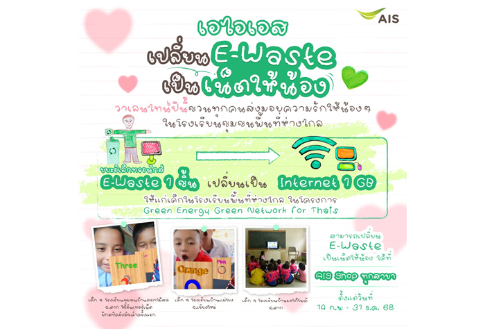 AIS ชวนคนไทยร่วมส่งต่อความรักและโอกาสทางการศึกษาให้เด็กๆ ในพื้นที่ห่างไกล เนื่องในเดือนแห่งความรัก ผ่านแคมเปญ “เปลี่ยน E-Waste เป็นเน็ตให้น้อง” ส่งต่ออินเทอร์เน็ตจากพลังงานสีเขียวเพื่อการศึกษา โดยทุกๆ การทิ้ง E-Waste 1 ชิ้น จะถูกเปลี่ยนเป็นอินเทอร์เน็ต 1GB มอบให้กับโรงเรียนในชุมชนห่างไกล ภายใต้โครงการ Green Energy Green Network for THAIs เพื่อช่วยเสริมสร้างการเรียนรู้และพัฒนาคุณภาพชีวิตที่ดีกว่าให้แก่นักเรียนบนพื้นที่สูง โดยสามารถนำขยะอิเล็กทรอนิกส์มาทิ้งได้ที่ AIS Shop ทุกสาขา และองค์กรพันธมิตรกว่า 235 องค์กร รวมทั้งสิ้น 2,700 จุดทั่วประเทศ ตั้งแต่วันนี้ – 31 ธันวาคม 2568