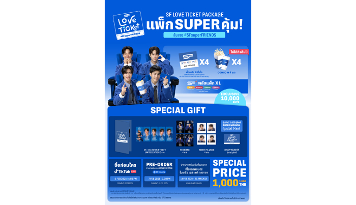 สุดคุ้มกับ “LOVE TICKET PACKAGE” แพ็กเกจดูหนังพร้อมของที่ระลึกจาก SF Super Friends พร้อมให้เป็นเจ้าของจำนวนจำกัด ภายในแพ็กประกอบด้วยด้วย บัตรชมภาพยนตร์ (Deluxe) จำนวน 4 ที่นั่ง, ชุดคอมโบไซซ์ M จำนวน 4 ชุด, Voucher เติมสิทธิ์ SF+ Package 1 สิทธิ์ พร้อมของพรีเมี่ยมสุด Exclusive จาก ได้แก่ SF+ Collectible Ticket จำนวน 5 ใบ, Postcard จำนวน 4 ใบ, Selfie Polaroid จำนวน 4 ใบ และรหัสสำหรับร่วมกิจกรรม Lucky Fans – LOVE TICKET ลุ้นเป็นผู้โชคดีเข้าร่วมกิจกรรม SF Super Mission Special Meet กับ 4 หนุ่ม SF Super Frinds ในราคาแพ็กเกจละ 1,000 บาท เริ่มจำหน่ายที่โรงภาพยนตร์ในเครือ เอส เอฟ ทุกสาขา (ยกเว้นสาขาเอ็มพรีเว่ ซีเนคลับ) ตั้งแต่วันที่ 14 กุมภาพันธ์ 2568 ถึง วันที่ 30 เมษายน 2568 (หรือจนกว่าสินค้าจะหมด)