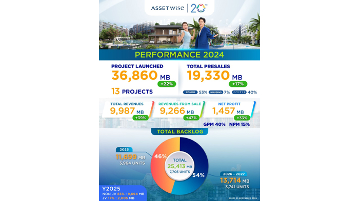 นายกรมเชษฐ์ วิพันธ์พงษ์ ประธานเจ้าหน้าที่บริหาร บริษัท แอสเซทไวส์ จำกัด (มหาชน) หรือ ASW บริษัทพัฒนาอสังหาริมทรัพย์ที่เป็นผู้นำด้านไลฟ์สไตล์ภายใต้แนวคิด “ความสุขที่ออกแบบมาเพื่อคุณ” หรือ “We Build Happiness” กล่าวว่า ผลการดำเนินงานปี 2567 บริษัทสามารถสร้างยอดขายรวม 19,330 ล้านบาท เติบโตราว 17% จากปี 2566 และเกินกว่าเป้าหมายยอดขายที่ตั้งไว้ที่ 17,800 ล้านบาท ขณะเดียวกัน บริษัทมีรายได้รวมทั้งสิ้น 9,987 ล้านบาท เพิ่มขึ้น 39% จากปีก่อนหน้า เกินเป้าหมายรายได้เดิมที่เคยตั้งไว้ที่ 8,700 ล้านบาท และสามารถทำกำไรสุทธิ 1,457 ล้านบาท เติบโตขึ้นจากปีก่อนหน้า 33% ซึ่งถือเป็นสถิติรายได้และกำไรสุทธิที่สูงที่สุดนับตั้งแต่ก่อตั้งบริษัท (New High)