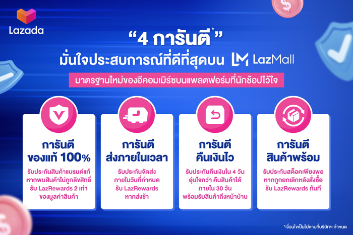 ล่าสุด ลาซาด้า เดินหน้ายกระดับประสบการณ์บน LazMall ไปอีกขั้นกับการอัปเกรดบริการภายใต้แนวคิด “4 การันตี” สร้างมาตรฐานใหม่ให้อีคอมเมิร์ซและความมั่นใจเพิ่มขึ้นให้นักช้อป ดังนี้