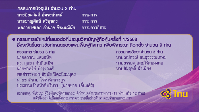สำหรับการดำเนินการตามแผนฟื้นฟูกิจการในขั้นตอนถัดไป ที่ประชุมคณะผู้บริหารแผนดำเนินการเพื่อบรรลุเงื่อนไขผลสำเร็จของแผนฟื้นฟูกิจการข้อสุดท้าย โดยได้มีมติเรียกประชุมวิสามัญผู้ถือหุ้นซึ่งจะจัดขึ้นตามข้อกำหนดของแผนฟื้นฟูกิจการในวันศุกร์ที่ 18 เมษายน 2568 และกำหนดวันกำหนดรายชื่อผู้ถือหุ้นที่มีสิทธิเข้าร่วมประชุมและออกเสียงในที่ประชุมวิสามัญผู้ถือหุ้น (Record Date) เป็นวันศุกร์ที่ 14 มีนาคม 2568 เพื่อพิจารณาอนุมัติกำหนดจำนวนกรรมการบริษัท จำนวน 11 ท่านหรือ 12 ท่าน ซึ่งประกอบด้วยกรรมการในปัจจุบันจำนวน 3 ท่าน ได้แก่ นายปิยสวัสดิ์ อัมระนันทน์ นายชาญศิลป์ ตรีนุชกร และพลอากาศเอก อำนาจ จีระมณีมัย และกรรมการเข้าใหม่จำนวน 8 ท่านหรือ 9 ท่าน (ตามแต่จำนวนกรรมการที่ที่ประชุมผู้ถือหุ้นลงมติอนุมัติ) โดยรายนามกรรมการเข้าใหม่ที่เสนอต่อที่ประชุมผู้ถือหุ้นเพื่อพิจารณาเลือกตั้งประกอบด้วยกรรมการจำนวน 6 ท่าน ได้แก่ นายลวรณ แสงสนิท ดร. กุลยา ตันติเตมิท นายชาครีย์ บำรุงวงศ์ พลตำรวจเอก ธัชชัย ปิตะนีละบุตร นายชาติชาย โรจน์รัตนางกูร และนายชาย เอี่ยมศิริ และกรรมการอิสระจำนวน 3 ท่าน ได้แก่ นายณปกรณ์ ธนสุวรรณเกษม นายยรรยง เดชภิรัตนมงคล และนายสัมฤทธิ์ สำเนียง ทั้งนี้ ภายหลังจากบริษัทฯ ได้รับมติอนุมัติจากที่ประชุมวิสามัญผู้ถือหุ้นแล้ว และได้รับอนุญาตจากศาลล้มละลายกลางแล้ว บริษัทฯ จะดำเนินการจดทะเบียนการเปลี่ยนแปลงจำนวนกรรมการ และการแต่งตั้งจดทะเบียนกรรมการใหม่ ก่อนที่จะดำเนินการยื่นคำร้องต่อศาลล้มละลายกลางเพื่อขอยกเลิกการฟื้นฟูกิจการต่อไป