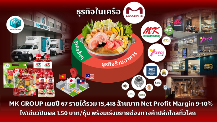 บริษัท เอ็มเค เรสโตรองต์ กรุ๊ป จำกัด (มหาชน) หรือ MK GROUP และบริษัทย่อย รายงานผลดำเนินการปี 2567 มีรายได้จากการขายและบริการเท่ากับ 15,418 ล้านบาท ซึ่งลดลงร้อยละ 7.5 เมื่อเทียบกับช่วงเดียวกันของปีก่อน โดยเป็นผลมาจากกำลังซื้อของผู้บริโภคที่อ่อนตัวลงจากค่าครองชีพและภาระหนี้ครัวเรือนที่สูงขึ้น รวมถึงการแข่งขันที่ค่อนข้างสูงในธุรกิจร้านอาหาร ส่งผลกระทบต่อธุรกิจร้านอาหารเชนในประเทศไทยอย่างมีนัยสำคัญ ในปี 2568 ทางบริษัทมีการปรับกลยุทธ์การตลาดใหม่ ๆ ที่มีความคุ้มค่าและคงคุณภาพ เพื่อเพิ่มการรับรู้ของแบรนด์ให้มากขึ้น และดึงดูดความสนใจจากกลุ่มผู้บริโภค ขณะที่ธุรกิจรีเทลมีการเตรียมแผนการขยายช่องทางทั่วโลก และมองหาโอกาสในการเติบโตจากการลงทุนในธุรกิจใหม่ อย่างไรก็ตามทางบริษัทยังมีอัตราส่วนหนี้สินต่อทุน (D/E) อยู่ในระดับต่ำที่ 0.41 เท่า สะท้อนให้เห็นถึงคุณภาพการเงินของบริษัทที่ยังคงแข็งแรงและมั่นคง อีกทั้งยังรักษาอัตราส่วนกำไรสุทธิอยู่ในเกณฑ์ดี 9-10% แสดงถึงการบริหารต้นทุนและควบคุมค่าใช้จ่ายได้ดี ซึ่ง MK GROUP ยังอนุมัติการจ่ายเงินปันผล 1.50 บาท ต่อหุ้นอีกด้วย