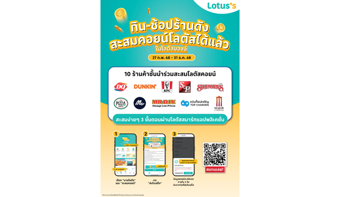 แคมเปญ ‘กินช้อปร้านดัง รับโลตัสคอยน์’ ไม่เพียงแต่จะมอบความคุ้มค่า แต่ยังยกระดับประสบการณ์ช้อปปิ้งผ่านการเชื่อมโยงไลฟ์สไตล์ของลูกค้าให้ได้ฟินและอิ่มอร่อยกับพันธมิตรแบรนด์ดังทั่วประเทศ อาทิ Dairy Queen, Dunkin’ Donuts, KFC, MR.DIY, MC Jeans, Major Cineplex, S&P, Swensen’s, The Pizza Company และ Top Charoen