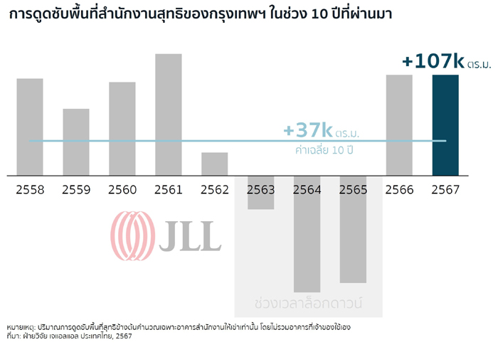นายไมเคิล แกลนซี่ กรรมการผู้จัดการ เจแอลแอล ประจำประเทศไทย อินโดนีเซีย ฟิลิปปินส์ และ เวียดนามกล่าวว่า “เราเห็นการกลับมาของเทรนด์การทำงานแบบไฮบริด โดยองค์กรใหญ่ ๆ ได้เพิ่มจำนวนวันที่ต้องทำงานในสำนักงานเป็น 3-4 วันต่อสัปดาห์โดยเฉลี่ยซึ่งส่งผลให้เกิดความต้องการพื้นที่สำนักงานระดับพรีเมียมเพิ่มขึ้น โดยเฉพาะอย่างยิ่งในโครงการมิกซ์ยูส (Mixed-used)ที่มีสิ่งอำนวยความสะดวกครบครัน เพื่อตอบโจทย์ความต้องการของพนักงานที่เปลี่ยนแปลงไป นอกจากนี้ หลายบริษัทที่เคยลดขนาดสำนักงานเริ่มตระหนักว่าบริษัทต้องการพื้นที่มากขึ้นเพื่อรองรับพนักงานที่กลับเข้ามาทำงานในสำนักงาน ส่งผลให้เกิดการขยายตัวในตลาด โดยคุณภาพของสำนักงานกลายเป็นปัจจัยสำคัญในการเลือกงาน ทำให้เจ้าของอาคารและผู้เช่าที่ลงทุนในการปรับปรุงพื้นที่จะได้เปรียบในการรองรับเทรนด์สำคัญที่กำลังเกิดขึ้นนี้”