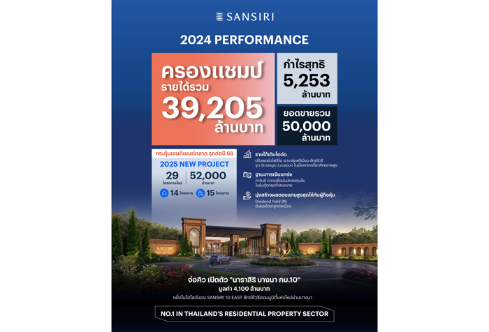 นายวิชาญ วิริยะภูษิต ประธานผู้บริหารสายงานการเงิน บริษัท แสนสิริ จำกัด (มหาชน) หรือ SIRI บริษัท อสังหาริม ทรัพย์ชั้นนำของไทย เปิดเผยว่า “แสนสิริสามารถสร้างผลการดำเนินงานในปี 2567 ได้อย่างมีประสิทธิภาพและหลายส่วนเป็นไปตามแผนงานที่วางไว้ โดยมีรายได้รวมที่ 39,205 ล้านบาท เติบโตขึ้นเล็กน้อยจากปีก่อนหน้าด้านยอดขายรวมเติบโตขึ้น 2% จาก 49,000 ล้านบาท เป็น 50,000 ล้านบาท (63% มาจากโครงการแนวราบ, 37% มาจากคอนโดมิเนียม) ขณะที่ยอดโอนเติบโตขึ้น 13% จาก 38,800 ล้านบาท เป็น 43,700 ล้านบาท (66% มาจากโครงการแนวราบ, 34% มาจากคอนโดมิเนียม) ความสำเร็จดังกล่าวมาจากกลยุทธ์การปรับพอร์ตโฟลิโอเพื่อเจาะกลุ่มความต้องการที่อยู่อาศัยระดับพรีเมี่ยม-ลักซ์ชัวรี รวมถึงการรุก Strategic Locations เมืองท่องเที่ยวใหญ่ที่มีศักยภาพ โดยสัดส่วนยอดขายและยอดโอนของบ้านเดี่ยวและทาวน์โฮมเติบโตในทิศทางเดียวกัน ขณะที่ยอดขายคอนโดมิเนียมปรับเพิ่มขึ้นเล็กน้อย สะท้อนถึงความต้องการคอนโดมิเนียมในกรุงเทพฯและต่างจังหวัดในบางทำเลที่ปรับตัวดีขึ้น จากแรงหนุนจากความต้องการของชาวต่างชาติและความต้องการอยู่อาศัยใกล้แนวรถไฟฟ้าหรือใกล้สถานศึกษาของคนไทย”