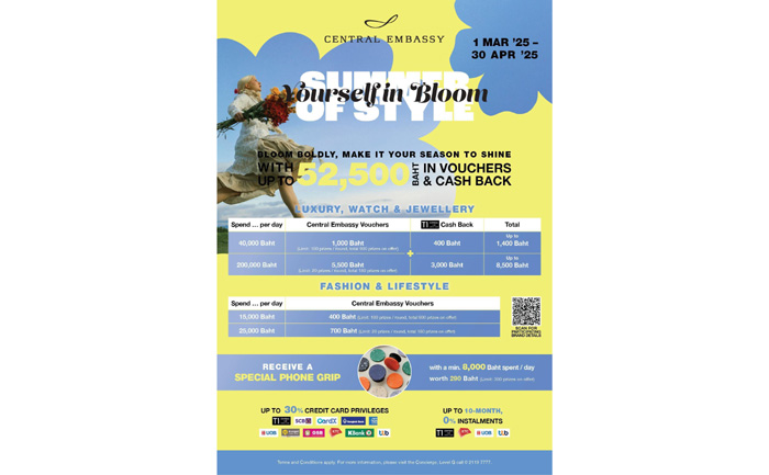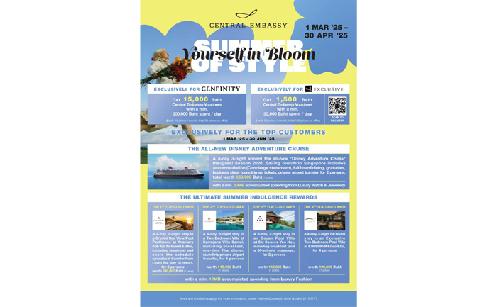 ซัมเมอร์นี้…สไตล์ไหนก็เอาอยู่! เซ็นทรัล เอ็มบาสซี จุดหมายแห่งประสบการณ์การช้อปปิ้งเหนือระดับของแฟชั่น นิสต้า เปิดรันเวย์แห่งสไตล์กับ “Summer of Style 2025” ตั้งแต่วันที่ 1 มี.ค. 68 ถึง 30 เม.ย. 68 พบกับอาณาจักรแบรนด์ดังระดับโลกทั้งลักชัวรีแบรนด์ชั้นนำ สตรีทแวร์สุดฮอต และไลฟ์สไตล์ไอเท็มที่ตอบโจทย์ทุกความต้องการ มาอัปเดตเทรนด์ใหม่ เติมความชิคให้เต็มพิกัดพร้อมรับรางวัลใหญ่! เอ็กซ์คลูซีฟทริปพักผ่อนเหนือระดับ กับทริปล่องเรือสำราญสุดหรูที่สิงคโปร์ รวมมูลค่า 550,000 บาท และแพ็คเกจบัตรกำนัลที่พักระดับลักชัวรีที่คัดสรรมาเพื่อ Top Customer ที่มียอดช้อปสะสมครบตามเงื่อนไข พร้อมรับข้อเสนอสุดพิเศษจากบัตรเครดิตเซ็นทรัล เดอะวัน และบัตรเครดิตชั้นนำที่ให้คุณช้อปอย่างจุใจบัตรกำนัลเงินสด เครดิตเงินคืน บัตรชมภาพยนตร์ และรางวัลอื่นๆ อีกมากมาย รวมมูลค่ากว่า 7 ล้านบาท เมื่อช้อปครบตามเงื่อนไข