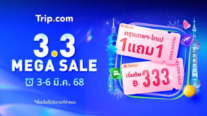 Trip.com ผู้ให้บริการด้านการท่องเที่ยวชั้นนำ ออกแคมเปญใหญ่ 3.3 Mega Sale ในวันที่ 3 – 6 มีนาคม 2568 ให้นักท่องเที่ยวได้จองทริปสุดคุ้ม ทั้งโปรโมชันโรงแรมราคาพิเศษคืนละ 333 บาท โปรโมชันตั๋วเครื่องบินซื้อ 1 แถม 1 และบัตรเข้าสถานที่ท่องเที่ยวชั้นนำราคาสุดคุ้มอีกมากมาย