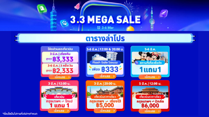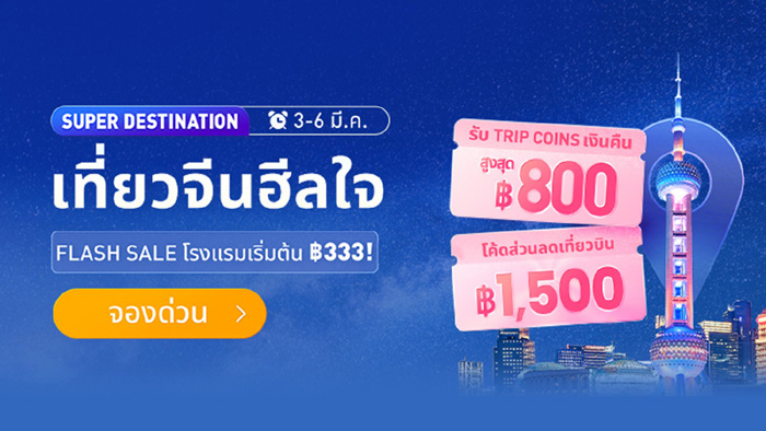 สำหรับนักเดินทางที่มีแผนเดินทางไปจีนในปีนี้ Trip.com ออกแคมเปญใหญ่ประจำปี “Super China” ที่จะจัดโปรโมชันพิเศษทั้งตั๋วเครื่องบินไปจีน โรงแรมที่จีนราคาพิเศษ และบัตรเข้าสถานที่ท่องเที่ยวยอดนิยมต่างๆในจีน โดยจะมีการจัดโปรโมชันทุกวันพุธ ตลอดปี 2025 โดยแต่ละเดือนมีข้อเสนอโปรโมชันที่แตกต่างกันไปให้คุณได้สัมผัสประสบการณ์ การเดินทางไปเที่ยวจีน ที่สะดวกสบายและคุ้มค่าที่สุด พร้อมกับโปรโมชั่น ‘3.3 Mega Sales’ ในวันที่ 3 – 6 มีนาคม 2568 เพื่อวางแผนการเดินทางครั้งต่อไปอย่างสุดคุ้ม จองและศึกษารายละเอียดเพิ่มเติมของโปรโมชั่น ที่ Trip.com คลิก https://th.trip.com/sale/w/5493/2025-33.html?locale=th-th&curr=thb&transparentBar=1