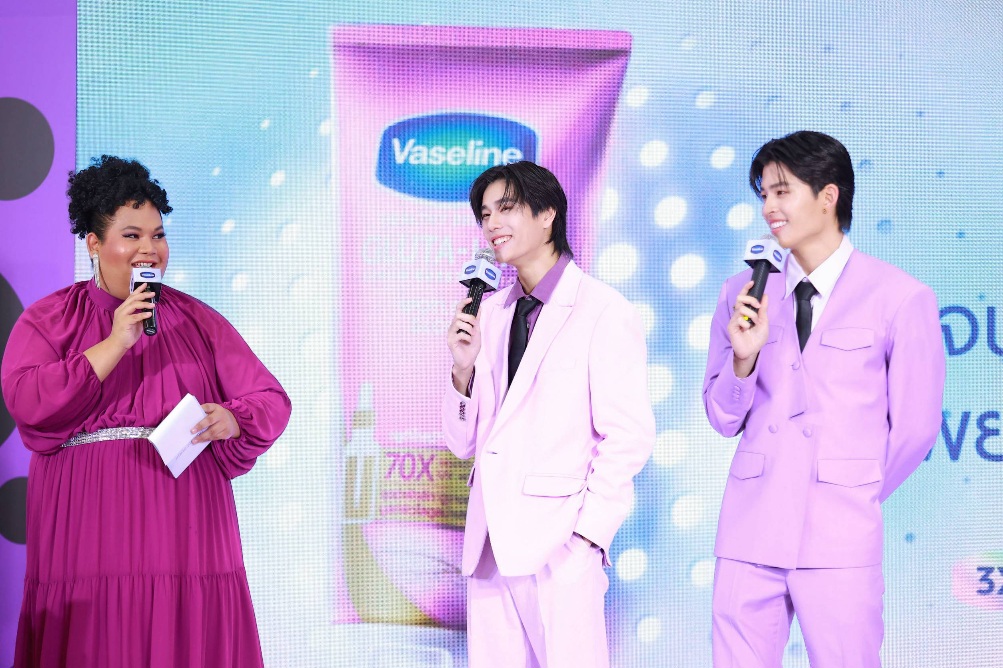 นอกจากนี้ ปอนด์-ณราวิชญ์ เลิศรัตน์โกสุมภ์ และ ภูวินทร์ ตั้งศักดิ์ยืน สองศิลปินสุดฮอต กล่าวถึงความประทับใจต่อผลิตภัณฑ์ว่า “ผมได้ทดลองใช้ วาสลีน กลูต้า-ไฮยา สปอตเลส โกลว์ แล้วรู้สึกประทับใจมากครับ เพราะเป็นผลิตภัณฑ์ที่ช่วยลดปัญหาจุดดำสะสมตามตัวให้จางลงได้จริง ยิ่งถ้าใช้เป็นประจำอย่างต่อเนื่อง จะสามารถช่วยให้ผิวกายดูกระจ่างใสขึ้นอย่างเห็นได้ชัด นอกจากนี้ยังมีกันแดดในตัวอีกด้วย ตอบโจทย์ผมมากๆ ผมจึงอยากแนะนำให้ทุกคนได้ลองใช้กัน เพื่อมีผิวใสฉ่ำโกลว์ไปพร้อมๆ กันครับ”
