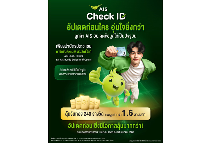 สิทธิพิเศษสำหรับลูกค้ามือถือ AIS ทั้งเติมเงินและรายเดือน ที่เข้ามายืนยันตัวตน ณ จุดบริการ AIS Check ID ตั้งแต่วันที่ 1 มีนาคม – 30 เมษายน 2568 จะได้รับสิทธิ์ในการจับรางวัล จำกัด 1 หมายเลขโทรศัพท์ ต่อ 1 สิทธิ์ ตลอดโครงการ โดยแบ่งเป็น รางวัลที่ 1 ทองคำ 1 สลึง จำนวน 40 รางวัล และ รางวัลที่ 2 ทองคำครึ่งสลึง จำนวน 200 รางวัล จับรางวัลทุก 2 สัปดาห์ ประกาศผลผ่านแอปฯ myAIS ติดตามรายละเอียดเพิ่มเติมได้ที่ https://m.ais.co.th/EKH6eO7Hy