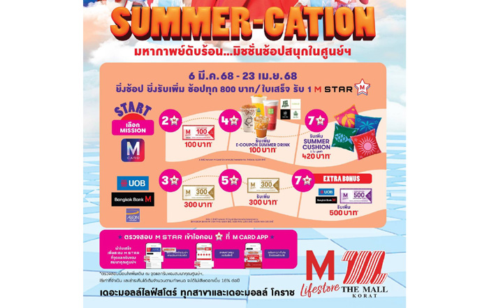ใช้จ่ายภายในห้างสรรพสินค้าเดอะมอลล์ไลฟ์สโตร์, เอ็มโพเรียม เอ็มควอเทียร์, เอ็มสเฟียร์ และพารากอน ดีพาร์ทเม้นท์สโตร์ ประเดิมความฮอตรับซัมเมอร์ 2025 ระดมสินค้าคอลเล็กชั่นใหม่ และสินค้ายอดนิยมลดสูงสุด 70% พร้อมดีลพิเศษทุกศุกร์ เสาร์ อาทิตย์ ตลอดแคมเปญ รับของสมนาคุณรวมมูลค่ากว่า 19 ล้านบาท เมื่อร่วมกิจกรรมช้อปตามกำหนด พิเศษทุกศุกร์ เสาร์ อาทิตย์ ช้อปสะสม M STAR รับของสมนาคุณรวมมูลค่ากว่า 14 ล้านบาท และช้อป ผ่านบัตรเครดิต BANGKOK BANK M VISA หรือ บัตรเครดิต กสิกรไทย ครบตามที่กำหนด รับเพิ่ม M Cash Coupon สูงสุด 1,800 บาท (รวม GOURMET MARKET และ POWER MALL)
