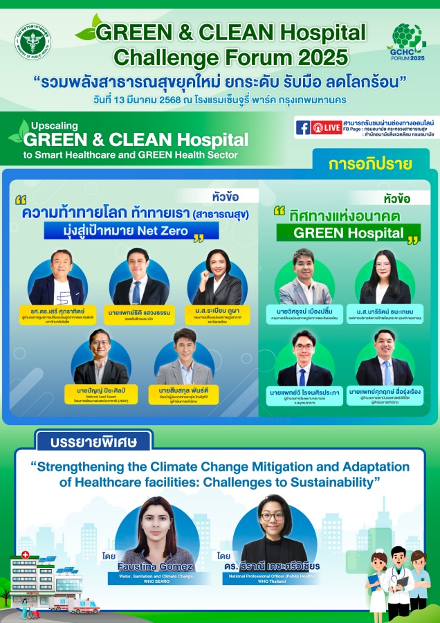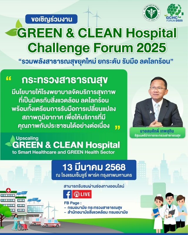 กรมอนามัย กระทรวงสาธารณสุข ขอเชิญบุคลากรสาธารณสุข หน่วยงานที่เกี่ยวข้อง และประชาชนผู้สนใจ เข้าร่วมงาน GREEN & CLEAN Hospital Challenge Forum 2025 (GCHC Forum 2025) ภายใต้หัวข้อ “Upscaling GREEN & CLEAN Hospital to Smart Healthcare and GREEN Health Sector” ในวันพฤหัสบดีที่ 13 มีนาคม 2568 ณ โรงแรมเซ็นจูรี่ พาร์ค กรุงเทพมหานคร