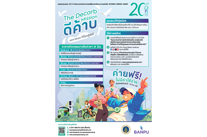 บริษัท บ้านปู จำกัด (มหาชน) ร่วมกับ คณะสิ่งแวดล้อมและทรัพยากรศาสตร์ มหาวิทยาลัยมหิดล อยากชวนนักเรียนชั้นมัธยมศึกษาปีที่ 4-6 ทั่วประเทศ (ไม่จำกัดแผนการเรียน) หรือระดับประกาศนียบัตรวิชาชีพ (ปวช.) ที่มีแพสชันในการอนุรักษ์สิ่งแวดล้อม และต้องการแสดงศักยภาพของคนรุ่นใหม่เพื่อร่วมสร้างสรรค์โลกให้คูลล์กว่าเดิม มาสมัครเข้าร่วม ค่ายเยาวชนวิทยาศาสตร์สิ่งแวดล้อม (Power Green Camp) ครั้งที่ 20 ซึ่งปีนี้จัดขึ้นภายใต้แนวคิด “ดีค้าบ – The Decarb Mission” ลดคาร์บอน ให้โลกคูลล์ เพื่อสร้างความรู้และความเข้าใจเกี่ยวกับการลดการปล่อยก๊าซคาร์บอนไดออกไซด์ (Decarbonization) และการนำเอาวิทยาศาสตร์และเทคโนโลยีไปช่วยแก้ไขปัญหาสิ่งแวดล้อมอย่างยั่งยืน