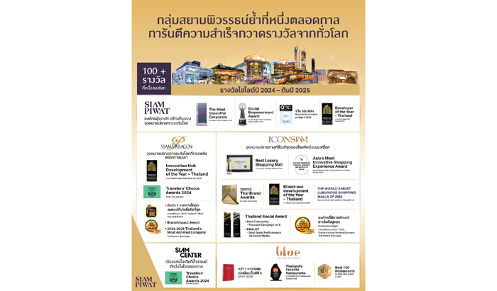 กลุ่มบริษัทสยามพิวรรธน์ ตอกย้ำผู้นำในการพัฒนาจุดหมายปลายทางแห่งประสบการณ์ระดับโลก ที่พิสูจน์ด้วยความสำเร็จอย่างต่อเนื่องตั้งแต่ปี 2024 จนก้าวสู่ปี 2025 ได้อย่างงดงาม ด้วยการคว้ารางวัลจากสถาบันชั้นนำทั้งในประเทศและระดับสากลมากกว่า 20 รางวัล โดยมีรางวัลสะสมที่เป็นที่หนึ่งของโลกกว่าร้อยรางวัล สะท้อนถึงความเชื่อมั่น และการเป็นองค์กรที่เป็นอันดับหนึ่งในใจผู้คน อันดับหนึ่งของโลกอย่างแท้จริง โดยมีรางวัลไฮไลต์สำคัญ ดังนี้