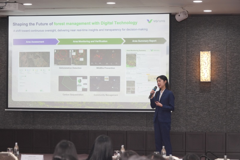 คุณพณัญญา เจริญสวัสดิ์พงศ์ ผู้ร่วมก่อตั้ง บริษัท วรุณา (ประเทศไทย) จำกัด ได้ร่วมแสดงวิสัยทัศน์และทิศทาง การรักษาสิ่งแวดล้อมของโลก ภายใต้หัวข้อ “Tech-Driven Pathways to Net-Zero: Forest Monitoring and Verified Carbon Credits” โดยเน้นย้ำถึงความสำคัญของการอนุรักษ์ป่าไม้ผ่านการลดการปล่อยก๊าซเรือนกระจก และรักษาสมดุลของระบบนิเวศ กล่าวว่า “ในยุคที่เรากำลังเผชิญกับการเปลี่ยนแปลงสภาพภูมิอากาศอย่างที่ไม่เคยเป็นมาก่อน การจัดการทรัพยากรธรรมชาติอย่างยั่งยืนถือเป็นกุญแจสำคัญในการลดการปล่อยก๊าซเรือนกระจกและ รักษาสมดุลของระบบนิเวศ โดยเฉพาะการอนุรักษ์ป่าไม้ ซึ่งเป็นป้อมปราการสำคัญในการกักเก็บคาร์บอนไดออกไซด์ เราจึงจำเป็นต้องใช้เครื่องมือที่ทันสมัยและแม่นยำ โดยเฉพาะ เทคโนโลยีภูมิสารสนเทศ (Geographic Information System: GIS) ดาวเทียมและอากาศยานไร้คนขับที่มีบทบาทสำคัญในการติดตามการเปลี่ยนแปลงของผืนป่าอย่างใกล้ ชิด ช่วยในการประเมินความสมบูรณ์และการเติบโตของป่า คำนวณปริมาณคาร์บอนที่ถูกกักเก็บคาร์บอนไดออกไซด์ ประเมินความเสี่ยงจากไฟป่าหรือการสูญเสียพื้นที่ป่า รวมถึงสนับสนุนการมีส่วนร่วมของชุมชนในการรายงานข้อมูล ทั้งนี้ยังช่วยส่งเสริมการลดการปล่อยคาร์บอนไดออกไซด์ภายในองค์กร และนำข้อมูลมาประกอบรายงานก๊าซเรือนกระจก (Greenhouse Gas Report: GHG Report) หรือรายงานความยั่งยืนตามแนวทาง ESG (Environmental Social Governance) ซึ่งสามารถติดตามผลได้อย่างต่อเนื่อง และช่วยให้องค์กรบรรลุเป้าหมาย Net Zero ได้อย่างยั่งยืน”