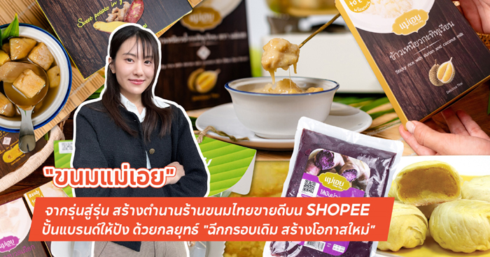 “ขนมแม่เอย” หนึ่งในแบรนด์ OTOP ภายใต้โครงการของกรมการพัฒนาชุมชน กระทรวงมหาดไทย ซึ่งมีชื่อเสียงและเป็นที่รู้จักอย่างกว้างขวางในวงการขนมไทย และ ได้ก้าวสู่ความสำเร็จในตลาดออนไลน์อย่างเต็มตัวผ่าน “ช้อปปี้” อีคอมเมิร์ซเบอร์ 1 ที่ครองใจผู้ใช้งานชาวไทย ช่วยผลักดันการขยายธุรกิจให้เติบโตอย่างรวดเร็วและมีประสิทธิภาพ การตัดสินใจขยายช่องทางจำหน่ายจากออฟไลน์สู่ออนไลน์ถือเป็นกลยุทธ์สำคัญที่ทำให้ยอดขายเพิ่มขึ้นและทำให้แบรนด์ได้รับการยอมรับในวงกว้าง