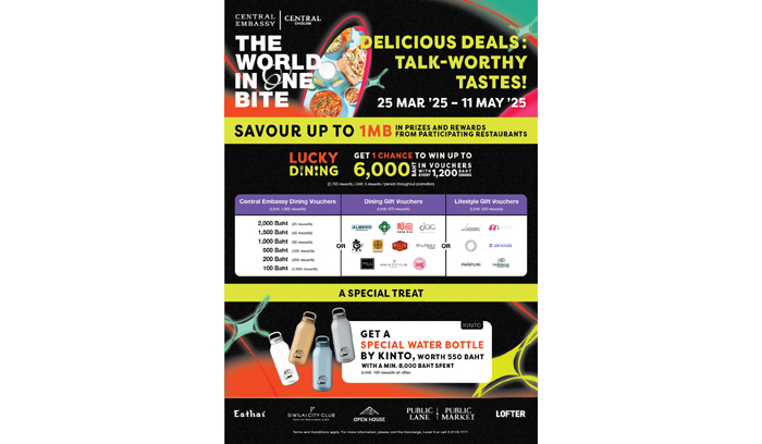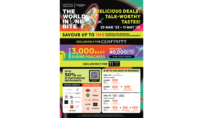 เซ็นทรัล เอ็มบาสซี และ เซ็นทรัล ชิดลม ศูนย์กลางแห่งรสชาติระดับโลก ผนึกกำลังมอบประสบการณ์ความอร่อยที่เหนือระดับ กับ “THE WORLD IN ONE BITE 2025” ชวนมาอิ่มอร่อยสุดฟิน จัดเต็มความคุ้มค่าให้ผู้ที่รักการกินและการช้อปปิ้งได้เต็มอิ่มในทุกรสชาติ พร้อมเติมต็มทุกรสสัมผัสกับสิทธิพิเศษเหนือระดับจากบัตรเครดิต เซ็นทรัล เดอะวัน และบัตรเครดิตชั้นนำอื่นๆ ที่ร่วมรายการตั้งแต่วันที่ 25 มี.ค. – 11 พ.ค. 68