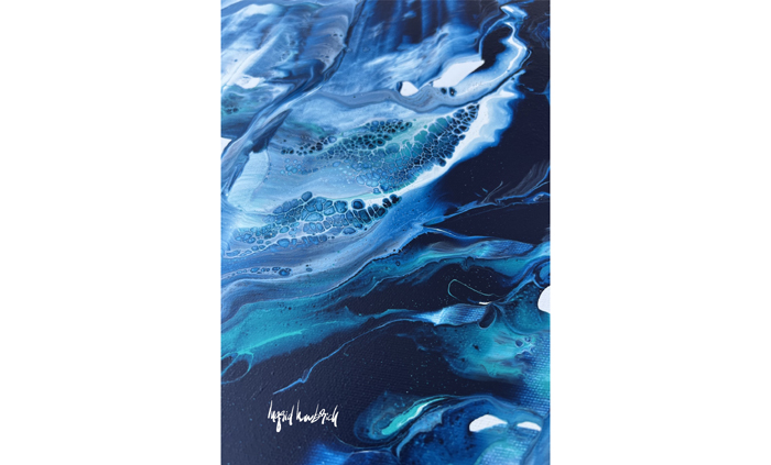 ผลงานชุด “กระแสน้ำ” แสดงให้เห็นถึงความลื่นไหลของสายน้ำ และยังแสดงถึงความไม่จีรังและพลังแห่งการปรับเปลี่ยนภูมิทัศน์ อินกริดได้ใช้เลเยอร์ของความโปร่งใสและพื้นผิวที่มีการเคลื่อนไหวเพื่อรังสรรค์กระแสน้ำขึ้นลงของมหาสมุทร ซึ่งเป็นพลังที่ลบล้างและวาดแนวชายฝั่งขึ้นมาใหม่ตามวัฏจักรแห่งการเริ่มใหม่ชั่วนิรันดร์ การเคลื่อนไหวนี้สะท้อนถึงพิธีกรรมชำระล้างของเทศกาลสงกรานต์ ไม่ว่าจะเป็นการสรงน้ำพระ คำอวยพรจากญาติผู้ใหญ่ในพิธีรดน้ำดำหัว และเสียงหัวเราะแซ่ซ้องท่ามกลางสายน้ำที่ถูกสาดกระเซ็นไปตามถนนหนทาง