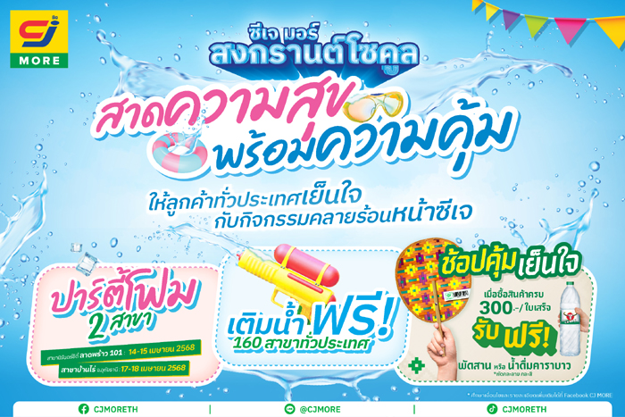 ร้อนแค่ไหนก็ไม่หวั่น! เทศกาลสงกรานต์ปีนี้ ซีเจ มอร์ (CJ MORE) เตรียมส่งมอบประสบการณ์ “สงกรานต์โซคุ้ม” ที่รวมความสนุก ความคุ้มค่า และความประทับใจมาให้แบบจัดเต็ม ทั้งโปรโมชั่นที่ให้ลูกค้าสมาชิกสบายการ์ดได้คลายร้อนกันทุกสาขาทั่วประเทศ พร้อมชวนลูกค้าดับร้อนด้วยการสืบสานประเพณีและเฉลิมฉลองปีใหม่ไทย ผ่านกิจกรรมปาร์ตี้โฟมสุดมันส์ และจุดเติมน้ำฟรีหน้าสาขาในช่วงเทศกาลสงกรานต์ที่กำลังจะถึงนี้