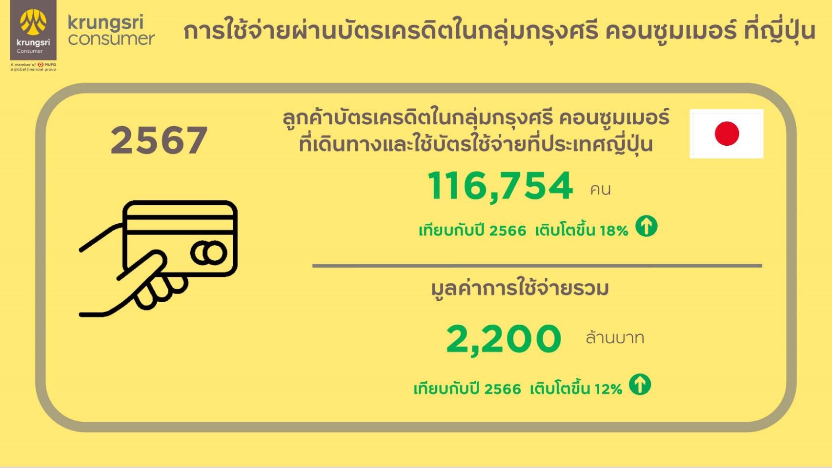 สอดรับกับข้อมูลของ “กรุงศรีคอนซูมเมอร์” ที่พบว่า ในปีที่ผ่านมา มีสมาชิกบัตรฯ เดินทางและใช้จ่ายที่ญี่ปุ่นกว่า 120,000 บัญชีบัตร เติบโต 18% และมียอดใช้จ่ายผ่านบัตรเครดิตที่ญี่ปุ่นรวมกว่า 2,200 ล้านบาท เติบโต 12% (YoY)