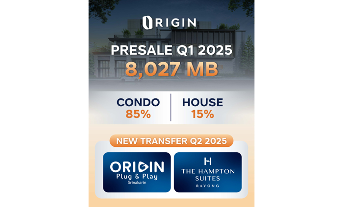 ออริจิ้น พร็อพเพอร์ตี้ กวาดยอดขายไตรมาส 1/2568 กว่า 8,027 ล้านบาท ไตรมาส 2/2568 จ่อโอนกรรมสิทธิ์เพิ่มอีก 2 โครงการ ตุน Backlog แล้วกว่า 1,700 ล้านบาท หนุน Backlog 45,389 ล้านบาท ทยอยรับรู้รายได้ 5 ปี