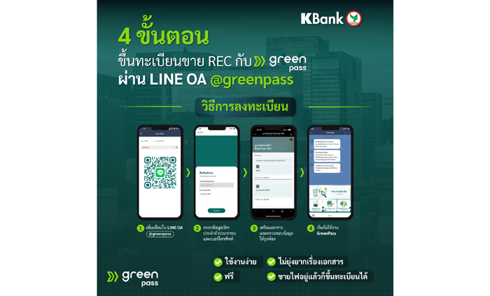 สำหรับผู้ที่สนใจขึ้นทะเบียนขาย REC ในช่วงแรกของการเปิดตัว จะต้องเป็นผู้ที่ติดตั้งโซลาร์รูฟ ท็อปโดยใช้ Invertor ของ HUAWEI ทั้งนี้ ลูกค้าธุรกิจ SME และลูกค้ารายย่อย สามารถขึ้นทะเบียนและขาย REC โดยลงทะเบียนได้ที่ LINE: @GreenPass เพื่อเริ่มต้นสร้างรายได้จากพลังงานสะอาดได้ทันที โดยไม่มีค่าใช้จ่าย อ่าน รายละเอียดเพิ่มเติมได้ที่ https://www.kasikornbank.com/greenpass หรือสอบถามข้อมูลเพิ่มเติมได้ที่ K Contact Center 02-8888888