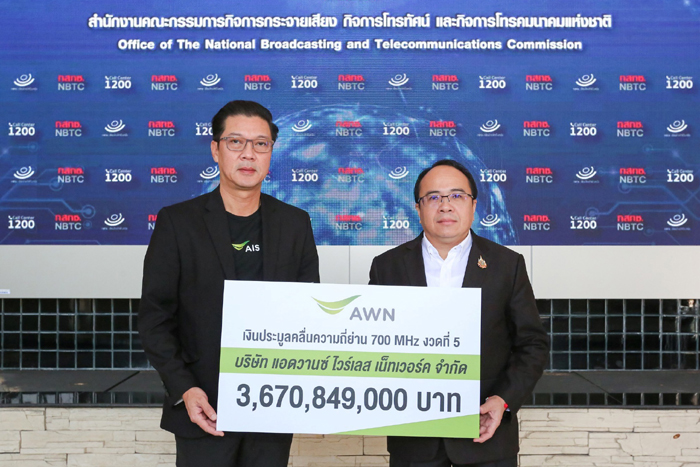 บริษัท แอดวานซ์ ไวร์เลส เน็ทเวอร์ค จำกัด (AWN) ในเครือ AIS เดินหน้าดำเนินธุรกิจตามแผนการลงทุนเพื่อยกระดับโครงสร้างพื้นฐานดิจิทัลของประเทศ เข้าชำระค่าคลื่นความถี่ย่าน 700 MHz งวดที่ 5 เป็นเงินจำนวน 3,670,849,000.00 บาท (สามพันหกร้อยเจ็ดสิบล้านแปดแสนสี่หมื่นเก้าพันบาทถ้วน) ให้แก่สำนักงานคณะกรรมการกิจการกระจายเสียง กิจการโทรทัศน์ และกิจการโทรคมนาคมแห่งชาติ (กสทช.) โดยมีนายสุทธิศักดิ์ ตันตะโยธิน รองเลขาธิการ กสทช. เป็นผู้แทนรับมอบ เพื่อการพัฒนากิจการโทรคมนาคมของประเทศไทยสู่อนาคตที่แข็ง แกร่งและยั่งยืน
