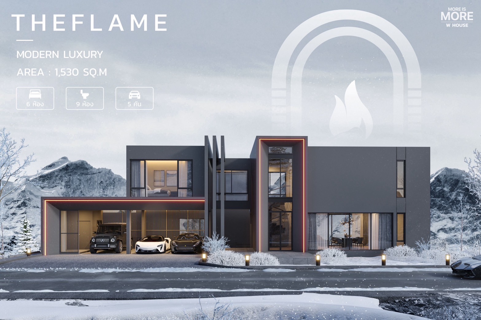 THE FLAME คฤหาสน์ 4 ชั้น สไตล์ Super Modern Luxury ขนาด 1,530 ตร.ม. จำนวน 6 ห้องนอน 9ห้องน้ำ และ 5 ที่จอดรถ ซึ่งได้แรงบันดาลใจจากเปลวไฟ ใช้โทนสีดำและไฟแดงส้มสร้างเอกลักษณ์ให้บ้านดูดุดัน หรูหรา และทรงพลัง พร้อมฟังก์ชันที่จัดจังหวะการใช้ชีวิตแบบไดนามิก