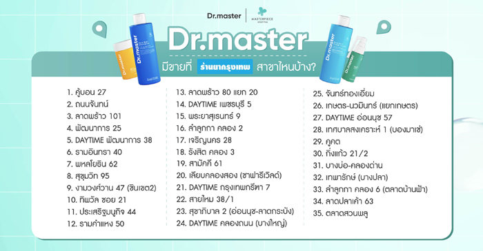 พบกับผลิตภัณฑ์ “Dr.master” ได้แล้ววันนี้ที่ “ร้านยากรุงเทพ” 35 สาขาทั่วกรุงเทพฯพร้อมรับคำปรึกษาจากเภสัชกรผู้เชี่ยวชาญ และค้นหาสาขาใกล้คุณได้ที่ https://www.bangkokdrugstore.co.th