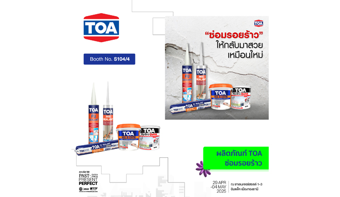 พร้อมพบกับนวัตกรรมซ่อมแซมบ้านหลังแผ่นดินไหว ด้วยเคมีภัณฑ์ก่อสร้างครบวงจรแบบ Total Solution ได้ที่บูธ TOA : หมายเลข S104/4 ในงานสถาปนิก ’68 ระหว่างวันที่ 29 เม.ย. – 4 พ.ค. 2568 ณ อิมแพค ชาเลนเจอร์ฮอลล์ เมืองทองธานี