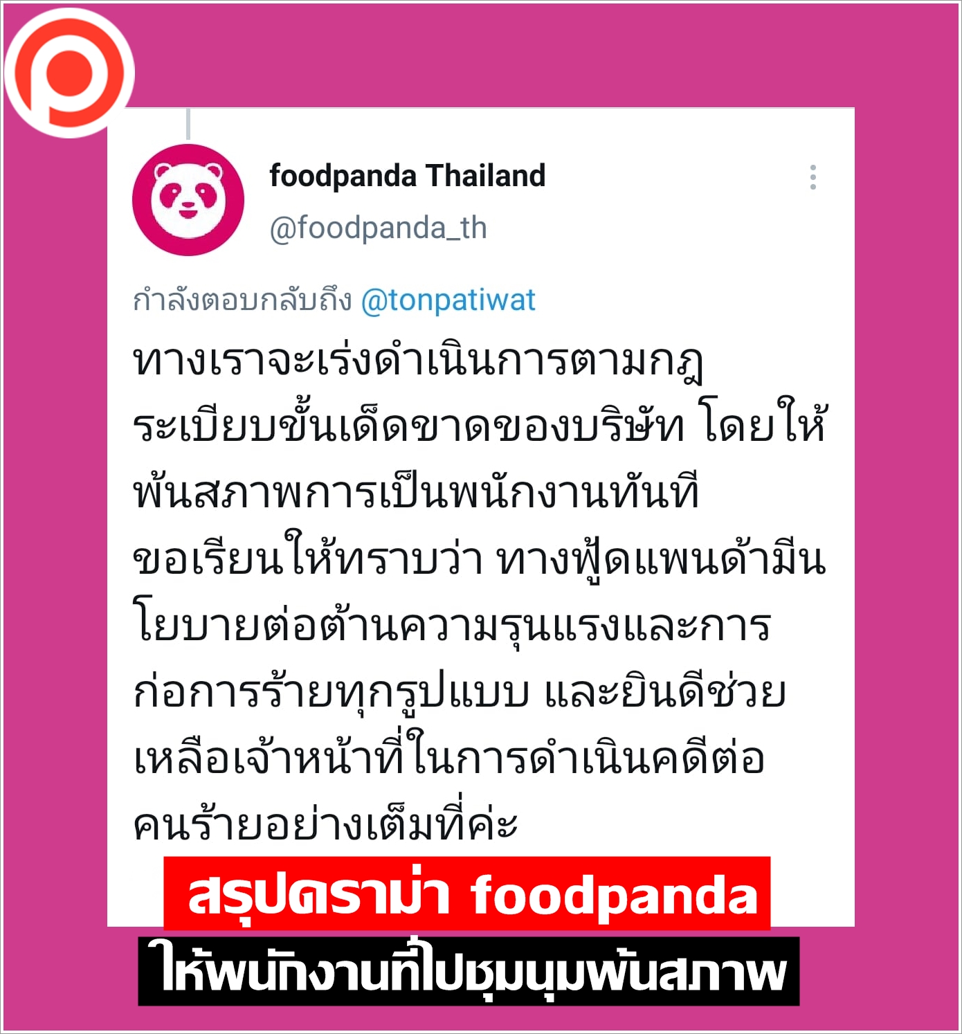 “ทางเราจะเร่งดำเนินการตามกฎระเบียบขั้นเด็ดขาดของบริษัท โดยให้พ้นสภาพการเป็นพนักงานทันที ขอเรียนให้ทราบว่า ทางฟู้ดแพนด้ามีนโยบายต่อต้านความรุนแรง และการก่อการร้ายทุกรูปแบบ และยินดีช่วยเหลือเจ้าหน้าที่ในการดำเนินคดีต่อคนร้ายอย่างเต็มที่ค่ะ”