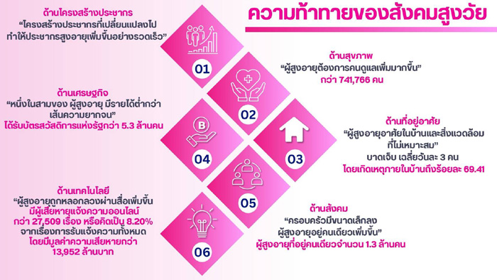 “กรมกิจการผู้สูงอายุได้ส่งเสริมกิจกรรมต่างๆ เช่น การส่งเสริมกิจกรรมจัดตั้งชมรมผู้สูงอายุเกือบ 30,000 ชมรมทั่วประเทศ และกิจกรรมโรงเรียนผู้สูงอายุกว่า 3,000 แห่ง เป็นการให้ความรู้และส่งเสริมทักษะต่าง ๆ เช่น การให้ความรู้สิทธิสวัสดิการ กฎหมายมรดก สิทธิสวัสดิการ และด้านนันทนาการ เพื่อให้ผู้สูงอายุได้มีกิจกรรมและความรู้ที่เหมาะสมกับความสนใจ นอกจากนี้ ยังเน้นให้ผู้สูงอายุมีความทรงพลัง สามารถใช้ชีวิตได้อย่างปกติ ทำงานได้ และลดการพึ่งพาลูกหลาน” นางสาวกอบกุล กล่าวเพิ่มเติม
