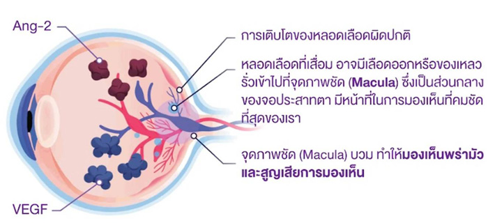 Degeneration หรือ nAMD) โรคนี้เกิดจากการสร้างเส้นเลือดผิดปกติใต้จอตา ซึ่งสามารถรั่วหรือแตกได้ ทำให้เกิดการสะสมของของเหลวหรือเลือดส่งผลให้การมองเห็นแย่ลงอย่างรวดเร็ว เป็นภาวะที่ต้องระวังเป็นพิเศษในผู้สูงอายุ ควรปรึกษาจักษุแพทย์ทันทีเมื่อมีอาการตามัวหรือมองเห็นจุดดำลอย เพราะหากไม่ได้รับการรักษาที่เร็วพอ อาจนำไปสู่การสูญเสียการมองเห็นถาวร ปัจจุบันมีแนวทางการรักษาหลายรูปแบบ 1.การฉีดยาเข้าน้ำวุ้นตา ซึ่งส่วนใหญ่ออกฤทธิ์ผ่านกลไกเดียว มีส่วนช่วยลดการงอกของเส้นเลือดที่จอประสาทตา ทำให้การมองเห็นดีขึ้น แต่อาจใช้ไม่ได้ผลในผู้ป่วยบางราย หรืออาจต้องฉีดบ่อยเพื่อให้ได้ผลการรักษาที่ดีขึ้น อย่างไรก็ดีในปัจจุบันการฉีดยาเข้าน้ำวุ้นลูกตามีการพัฒนามากขึ้น มีนวัตกรรมใหม่ที่ยับยั้ง 2 กลไกหลักของการเกิดโรค ช่วยทั้งลดการงอกและการรั่วของเส้นเลือด ลดการอักเสบ และเพิ่มความแข็งแรงของเส้นเลือด ออกฤทธิ์ได้นานขึ้น 2. การใช้เลเซอร์ ซึ่งวิธีนี้ช่วยชะลอโรคได้ แต่ไม่ช่วยให้การมองเห็นดีขึ้นมากนัก 3. การผ่าตัด ซึ่งมิได้ทําในทุกราย จักษุแพทย์จะพิจารณา อย่างไรก็ตาม การเลือกวิธีการรักษาขึ้นอยู่กับสภาพการเสื่อมของจอตาของผู้ป่วยแต่ละราย ควรปรึกษากับจักษุแพทย์เพื่อได้รับการดูแลและรักษาอย่างเหมาะสม
