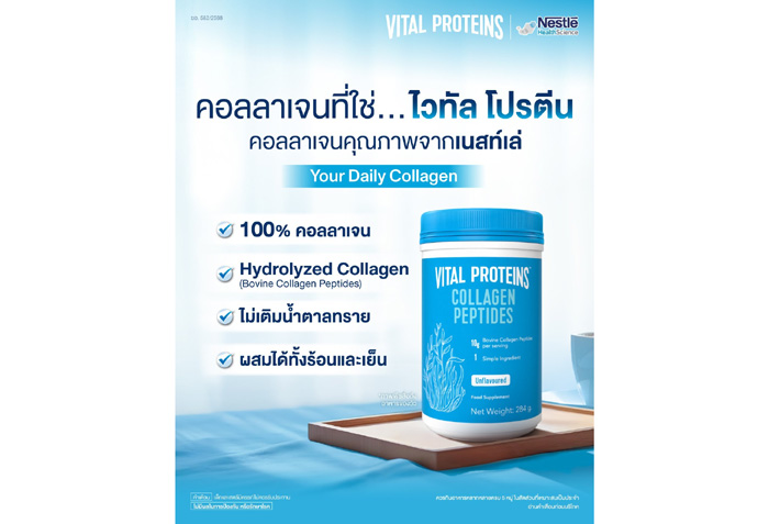 เนสท์เล่ เฮลท์ ไซเอนซ์ (Nestlé Health Science) ในฐานะหนึ่งในหน่วยธุรกิจ ที่มุ่งเน้นในการพัฒนาผลิตภัณฑ์อาหารเพื่อโภชนาการที่ดีภายใต้เนสท์เล่ เปิดตัวผลิตภัณฑ์เสริมอาหาร คอลลาเจนเปปไทด์ในรูปแบบผง ไวทัล โปรตีน คอลลาเจน เปปไทด์ (Vital Proteins Collagen Peptides) คอลลาเจนชั้นนำซึ่งเป็นที่ยอมรับในสหรัฐอเมริกาที่ได้รับการยอมรับจากทั่วโลก ตอบรับกระแสตลาดคอลลาเจนที่มีแนวโน้มเติบโตอย่างต่อเนื่อง โดยในกลุ่มคอลลาเจนแบบผงมีการเติบโตถึง 6.2% ในปี 2567* และมีการเติบโตในตลาดค้าปลีกเพิ่มขึ้นถึง 11% (ราว 3.95 หมื่นล้านบาท) พร้อมตอบโจทย์เทรนด์คนรักสุขภาพด้วยการนำเสนอผลิตภัณฑ์ที่ส่งเสริมการดูแลสุขภาพแบบองค์รวม ช่วยให้การดูแลสุขภาพในทุก ๆ วันเป็นเรื่องง่าย