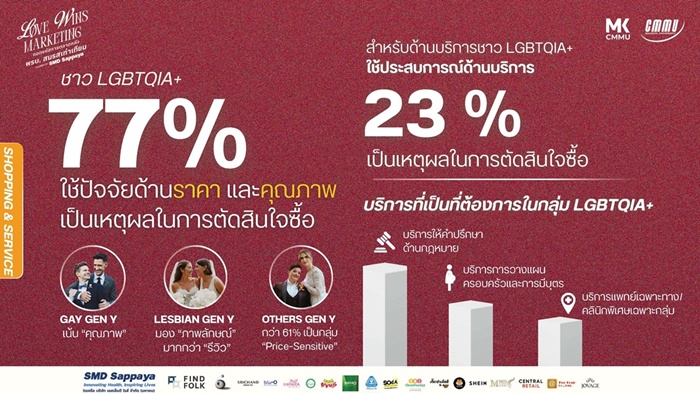 นอกจากนี้ยังพบอีกว่า 23% ของกลุ่ม LGBTQIA+ ใช้ประสบการณ์ด้านบริการเป็นเหตุผลในการตัดสินใจซื้อ โดยบริการที่เป็นที่ต้องการในกลุ่ม LGBTQIA+ ได้แก่ บริการให้คำปรึกษาด้านกฎหมาย, บริการการวางแผนครอบครัวและการมีบุตร และบริการแพทย์เฉพาะทาง/คลินิกพิเศษเฉพาะกลุ่ม