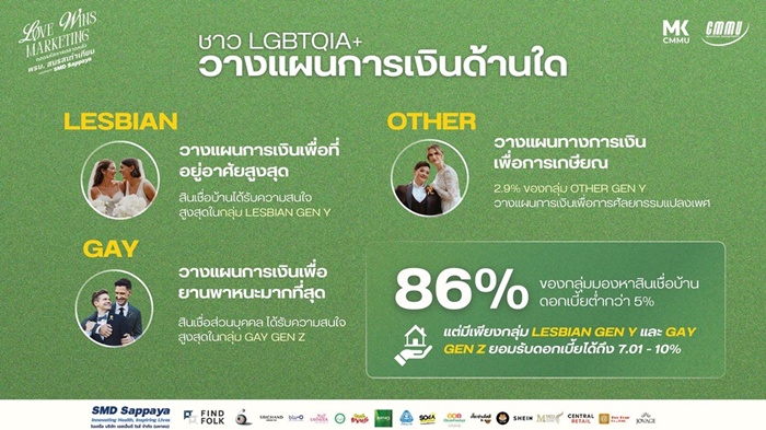 สำหรับด้านการวางแผนการเงินพบว่า กลุ่ม Lesbian วางแผนการเงินเพื่อที่อยู่อาศัยสูงที่สุด ขณะที่กลุ่ม Gay วางแผนการเงินเพื่อยานพาหนะมากที่สุด และกลุ่ม Others วางแผนการเงินเพื่อการเกษียณอายุและแปลงเพศที่ 2.9%