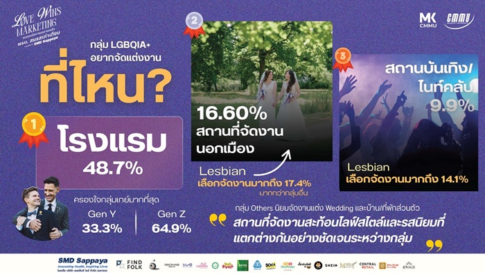 1.ด้านการแต่งงานและการใช้ชีวิตคู่ : 56.1% ของกลุ่ม LGBTQIA+ อยากจัดงานแต่งงาน โดย 48.7% นิยมจัดงานที่โรงแรม ซึ่งในจำนวนนี้พบว่า เป็นกลุ่ม Gay Gen Z มากที่สุดถึง 64.9% และนิยมจัดงานขนาดกลาง (50-100 คน) 54.4% ส่วนงบประมาณในการจัดงานเฉลี่ยอยู่ที่ 300,000-500,000 บาท และที่น่าสนใจคือ 4.7% ของกลุ่มนี้มีการวางแผนใช้งบประมาณมากกว่า 1 ล้านบาท โดยเฉพาะกลุ่ม Gay Gen Z