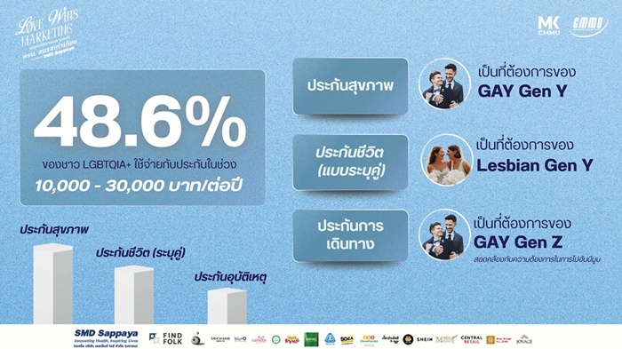6.ด้านสุขภาพและประกันภัย พบว่า 48.6% ของกลุ่ม LGBTQIA+ ใช้จ่ายกับประกันในช่วง 10,000-30,000 บาทต่อปี โดยประกันสุขภาพเป็นที่ต้องการของกลุ่ม Gay Gen Y มากที่สุด ประกันชีวิตแบบระบุผู้รับผลประโยชน์เป็นที่ต้องการของกลุ่ม Lesbian Gen Y มากที่สุด และประกันการเดินทางเป็นที่ต้องการของกลุ่ม Gay Gen Z มากที่สุด ซึ่งสอดคล้องกับความต้องการในการท่องเที่ยว