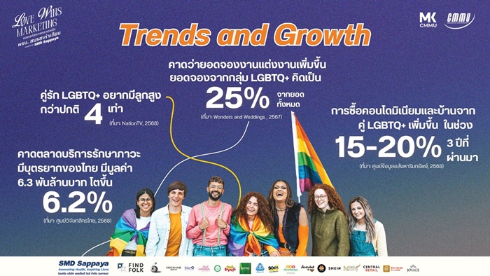 ผลวิจัยดังกล่าว เปิดเผยว่า หลัง พ.ร.บ. สมรสเท่าเทียมมีผลบังคับใช้ในปี 2568 ส่งผลให้กลุ่มผู้บริโภค LGBTQIA+ ในประเทศไทย ซึ่งมีจำนวนมากกว่า 5.9 ล้านคน หรือคิดเป็น 9% ของประชากรทั้งประเทศ กลายเป็นขุมพลังทางเศรษฐกิจใหม่ที่น่าจับตา เนื่องจากเป็นกลุ่มผู้บริโภคที่มี ‘กำลังซื้อและมีแนวโน้มใช้จ่ายสูง’