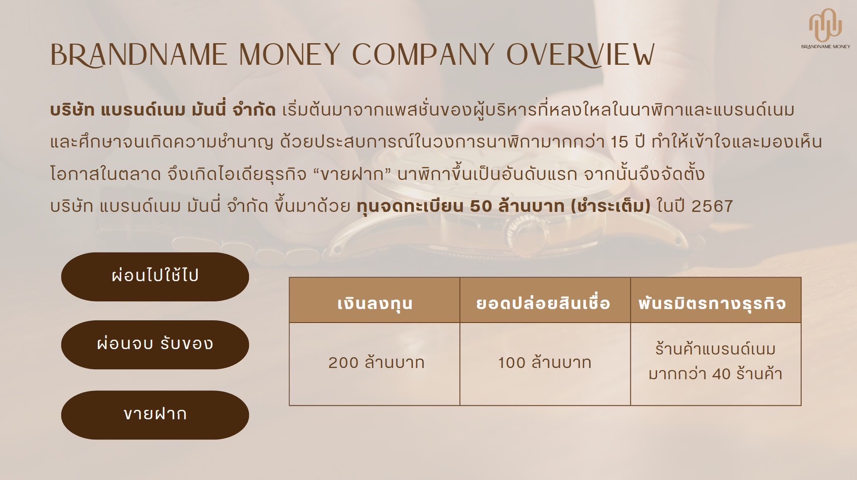 แม้ว่าตลาดแบรนด์เนมในไทยจะมีมูลค่ากว่าแสนล้านบาท แต่ที่ไทยไม่มีธุรกิจบริการสินเชื่อเช่าซื้อและขายฝาก แบรนด์เนมมาก่อน เป็นเพราะเป็นธุรกิจที่อาศัย ความเชี่ยวชาญสินค้าลักชัวรี ตั้งแต่ต้องดูว่าสินค้าเป็นของแท้หรือของปลอม ต้องคอยตามเทรนด์ความนิยม และต้องสามารถประเมินราคาสินค้ามือ 1 – มือ 2