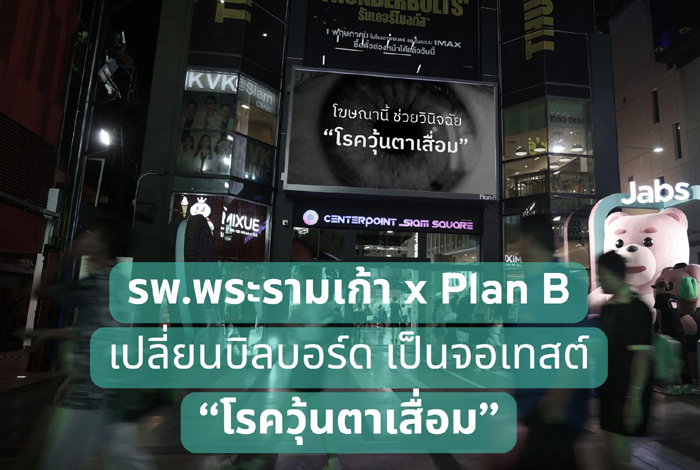 ใครจะคิดว่าแค่แหงนมองบิลบอร์ดข้างทาง ก็อาจช่วยคุณปกป้องดวงตาจากการมืดบอดได้ตลอดชีวิตโรงพยาบาลพระรามเก้าร่วมมือกับ Plan B Media สร้างสรรค์สื่อนอกบ้านรูปแบบใหม่ เปิดตัว “The Eye-Diagnostic Billboard” บิลบอร์ดสุดล้ำที่ให้คุณเช็กอาการ “วุ้นตาเสื่อม” เบื้องต้นได้ด้วยตัวเอง เพียง 15 วินาที หยุดดู หยุดสังเกต และอาจเปลี่ยนอนาคตการมองเห็นของคุณไปตลอดกาล!