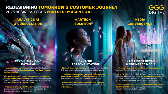 เอ้ก ดิจิทัล (EGG Digital) ผู้นำธุรกิจด้านวิเคราะห์ข้อมูลขนาดใหญ่ ให้บริการสื่อโฆษณาครบวงจรและการตลาดดิจิทัลที่ขับเคลื่อนด้วยพลัง AI อัจฉริยะ เปิดแผนปี 2568 ภายใต้แนวคิด “Redesigning Tomorrow’s Customer Journey – Powered by Intelligence, Inspired by Creativity” นำ EGG AI Agent ซึ่งเป็นเทคโนโลยี Agentic AI ที่ช่วยให้ธุรกิจเข้าใจผู้บริโภคในทุกมิติและทุกโมเมนต์ สามารถตัดสินใจแบบอัตโนมัติได้อย่างชาญฉลาด โดยนำมาผสานการทำงานกับดาต้า เทคโนโลยีขั้นสูง และความคิดสร้างสรรค์ เพื่อยกระดับประสิทธิ ภาพการทำการตลาด การสื่อสาร โฆษณา และการพัฒนาผลิตภัณฑ์ให้ตอบโจทย์ยุคลูกค้าอัจฉริยะ (Cognitive Customer) ที่เข้าใจทุกความต้องการและเข้าถึงได้ในทุก Touchpoint เดินหน้าส่งมอบ 5 Customer Engine ที่ขับเคลื่อนด้วย EGG AI Agent เทคโนโลยีอัจฉริยะที่ล้ำสมัยที่สุดในเอเชียตะวันออกเฉียงใต้ ตั้งเป้าช่วยหนุนธุรกิจไทยใช้ AI สร้างความได้เปรียบในการแข่งขัน พร้อมสร้างการเติบโตอย่างก้าวกระโดด ท่ามกลางโลกธุรกิจที่เทคโนโลยีและพฤติกรรมลูกค้าเปลี่ยนแปลงอย่างรวดเร็ว