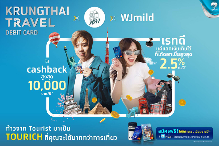บัตร Krungthai Travel Debit Card จับมือพรีเซนเตอร์สายท่องเที่ยว และ KOL สายท่องเที่ยวชั้นนำของเมืองไทยอีกมากกว่า 40 ท่าน ทั้งคุณว่านไฉ สาพาไปหลง, และคุณมายด์ WJmild พร้อมทั้ง KOL อีกมากมาย อาทิเช่น คุณพลอย-ชิดจันทร์, คุณพลอย Ploychava, คุณแคท Katheryn_lee, เพจเที่ยวแหลก ที่ไว้วางใจเลือกใช้บัตรนี้ในการเดินทางทั่วโลก! ด้วยนวัตกรรมเปลี่ยนโลกนักเดินทาง “ก้าวสู่การท่องเที่ยวข้ามพรมแดน ที่เหนือกว่าเดิม” ของบัตร Krungthai Travel Debit Card ที่รวม 2 ผลิตภัณฑ์เด็ดไว้ในบัตรเดียว ทั้ง Krungthai Travel Debit Card และ บัญชีเงินฝาก Global Savings ทำให้คุณ ทำธุรกรรมข้ามพรมแดน ได้เหนือกว่าเดิม ป๊อปปูล่าขั้นสุดกับบัตรแรกและบัตรเดียวในไทยที่ให้ดอกเบี้ยสูงสุด 2.5% ต่อปีเมื่อแลกเงินสกุลต่างประเทศเก็บไว้ช่วยให้คุณใช้จ่ายได้อย่างเหนือระดับเมื่อใช้จ่ายเงินสกุต่างประเทศ นวัตกรรมการเงินนี้จะพานักเดินทางก้าวข้ามจาก TOURIST ธรรมดา สู่การเป็น TOURICH มีให้เลือก 2 แบบสุดว๊าว Premium และ Platinum