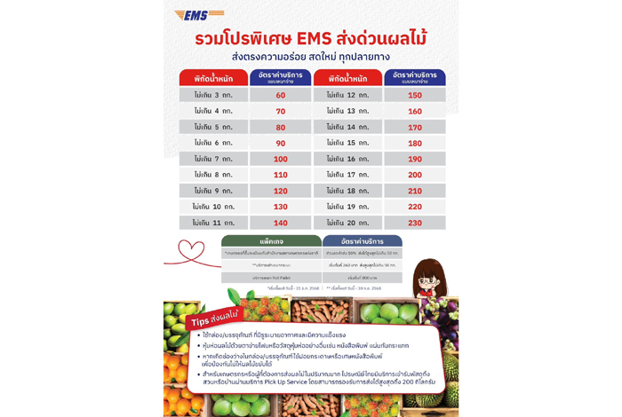 ทั้งนี้ EMS ส่งด่วนผลไม้ พร้อมส่งต่อผลไม้คุณภาพ สดจากสวนถึงมือผู้บริโภค ค่าส่งสุดคุ้มเริ่มต้นเพียง 3 กก. 60 บาท พร้อมบริการเหมา ๆ สำหรับลูกค้าเกษตรกรหรือผู้ประกอบการร้านค้าผลไม้ ทั้งแบบเช่าเหมากระบะเริ่มต้น 260 บาท ส่งได้สูงสุด 50 กก. และเช่าเหมา Roll pallet เริ่มต้น 800 บาท ส่งได้สูงสุด 200 กก. นอกจากนี้ยังมีกล่องและตะกร้าที่ออกแบบสำหรับการขนส่งผลไม้โดยเฉพาะ เพื่อสนับสนุนการจำหน่ายผลไม้ไทยสู่ตลาดออนไลน์และออฟไลน์ทั่วประเทศ โดยกล่องผลไม้มี 3 ขนาดราคาเริ่มต้น 20 บาทและตะกร้าผลไม้มี 3 ขนาดราคาเริ่มต้น 30 บาท ทั้งนี้สามารถใช้บริการได้ ณ ที่ทำการไปรษณีย์ทั่วประเทศ หรือเรียกพี่ไปรฯ เข้ารับฝากถึงที่ (Pick Up Service) ได้ฟรีไม่มีค่าใช้จ่ายเพิ่มเติม ทางไลน์ @Thailandpost